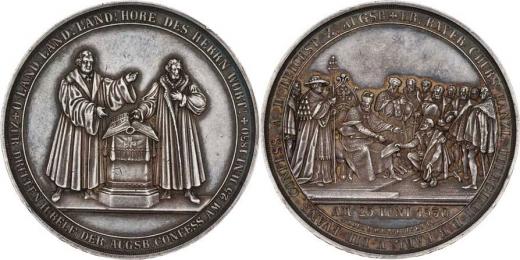 Pfeuffer a Loos - 300 let Augsburské konfese 1830 - Luther a Zwingli s knihou, opis / předání listiny císaři, písmo, Sign., Ag 44mm, 28.859g, dr.hr., rysky