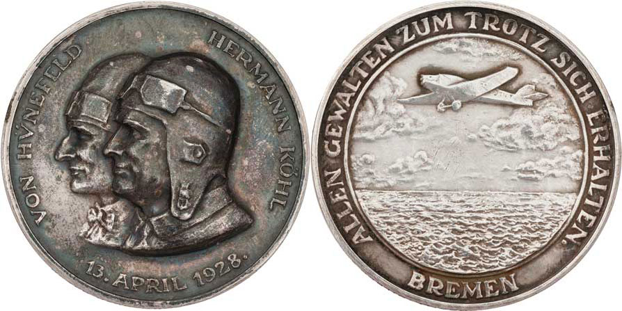 Let letadla Bremen do Ameriky 1928 - dvojportrét letců zleva, opis / letadlo nad mořem, opis, Nesign., Punc., Ag900, 36mm, 24.089g, nep.hr., nep.rys., pat.