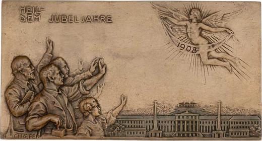 Schaefer 1908 - novoročenka rak.větve rodiny Krupp - lid zdraví Niké letící nad Schönbrunem, nápis, Sign., litý bronz 190x112 mm, pěkná patina