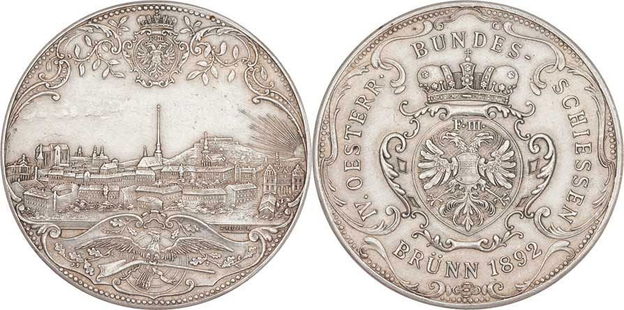 Brno 1892 - 4.rakouské spolkové střelby - pohled na město, znak, terč a puška/ znak v korunované kartuši, opis, Sign.Neudeck, Punc., Ag800, 36mm, 22.929g, rys.