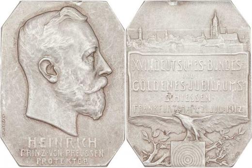 Frankfurt nad Mohanem 1912 - Pruský princ Heinrich zprava, nápis/ pohled na město, nápis, orlice a terč, Sign.Korschan, patin.Ag, 31x42 mm, 26.225g, dr.hr.