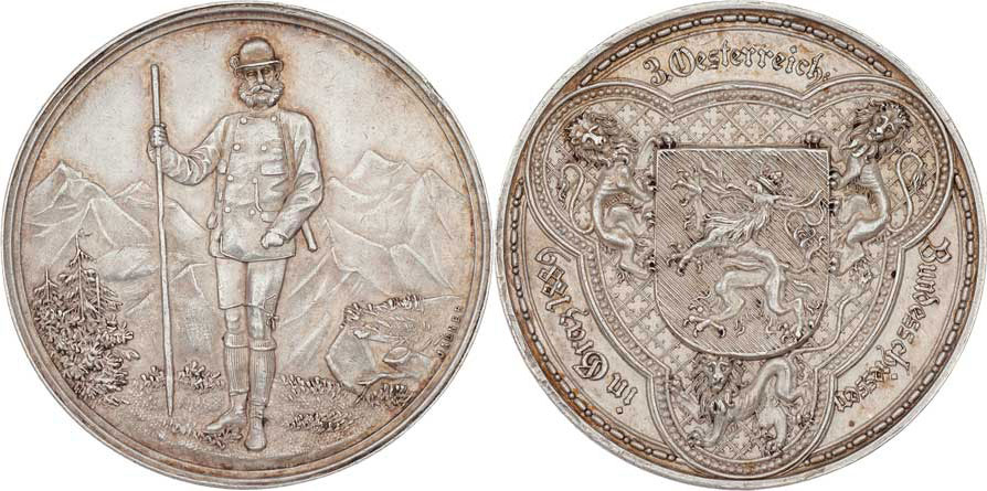 Graz - 2 Zlatník 1889 - III.rakouské spolkové střelby - stojící Fr.Josef I. v horách / štýrský znak, opis, Sign.Jauner, Ag 36mm, 24.573g, dr.hr., dr.rys., pat.