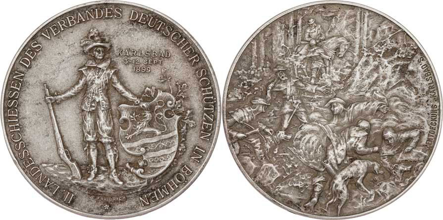 Karlsbad (Karlovy Vary) 1899 - II.něm. zems. střelby v Čechách - střelec s puškou a znakem, opis/ objevení pramenů, Sign.Friederich, Punc. Ag900, 38mm, 24.435g