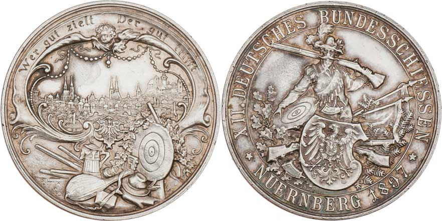 Norimberk 1897 - XII.něm.spolkové střelby - střelec s puškou, znak, prapory, opis / pohled na město, terč, opis, Sign., Ag 40mm, 29.468g, dr.hr., dr.rysky