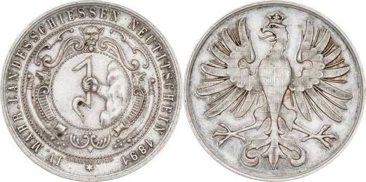 Nový Jičín 1891 - IV. moravské zemské střelby - moravská orlice / znak města v kartuši, německý opis, Sign.Christlbauer, Ag900, 37mm, 17.586g, patina