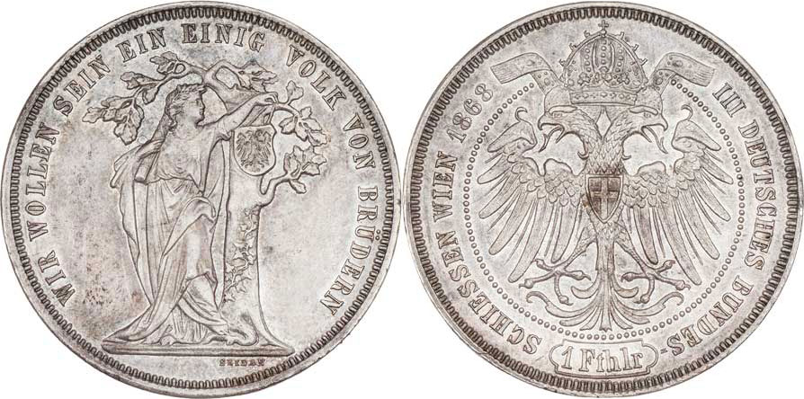 Vídeň - Sp.tolar 1868 - III.německé spolkové střelby - Austria u stromu, znak, opis / císařský znak, opis, Sign.Seidan, Ag900, 33mm, 16.888g, nep.hr., patina