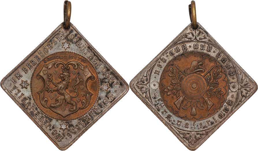 Weimar 1886 - 150 let spolku pro střelbu z pušek - městský znak, opis / terč, pušky, dubové listy, opis, Nesign., klipa 27x27 mm s původním ouškem, 12.575g