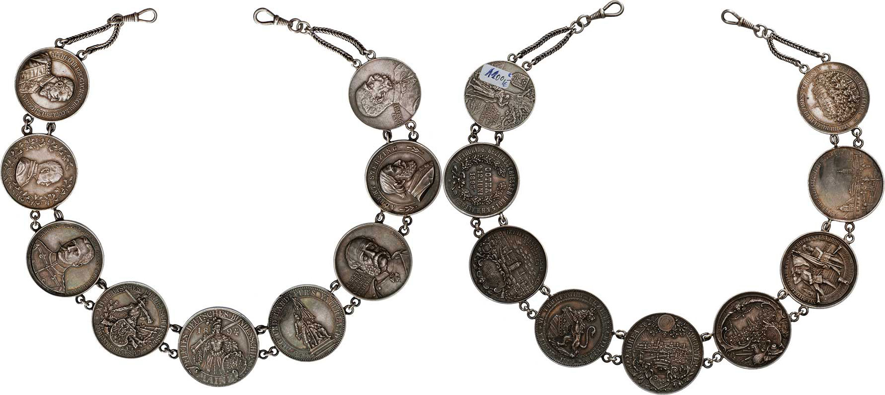 Skvostný střelecký náhrdelník vytvořený z devíti rakouských a německých střeleckých medailí tolarové velikosti, nepůvodní etue od jiné střelecké ceny RR!