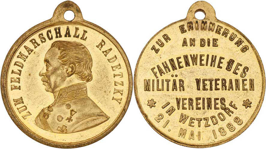 Wetzdorf 1888 - svěcení praporu veterán.spolku 21.5., poprsí maršála Radeckého zleva, opis / 7-řádk. nápis, Nesign., zlacený bronz 27 mm s původním raž. ouškem