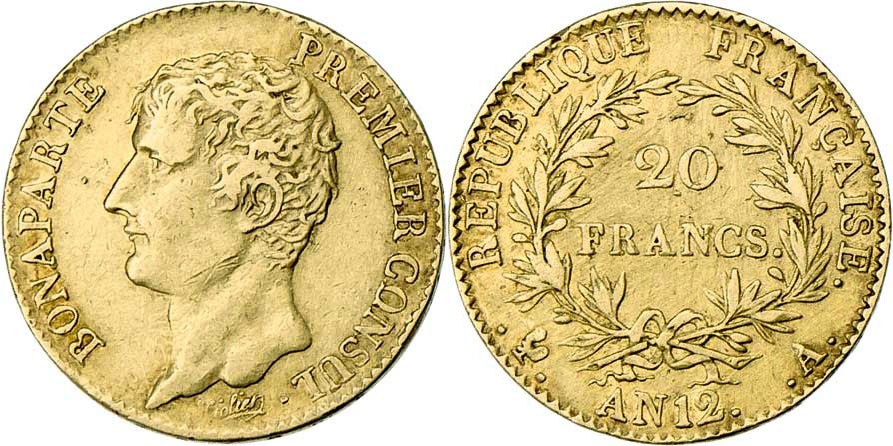 20 Frank, rok 12 (= 1804) A, KM.651, 6.417g, nep.hr., nep.rysky, dr.vada materiálu na hraně, patina, téměř