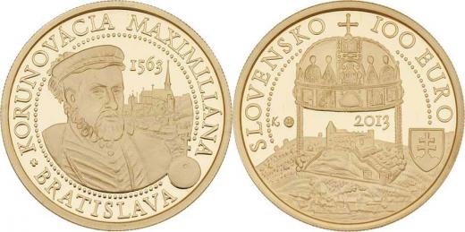 100 Euro 2013 - korunovace Maxmiliána II., KM.0-nové (Au900, 9.50g, pouze 6.000ks), kapsle, etue, karta, přebal, reklamní prospekt