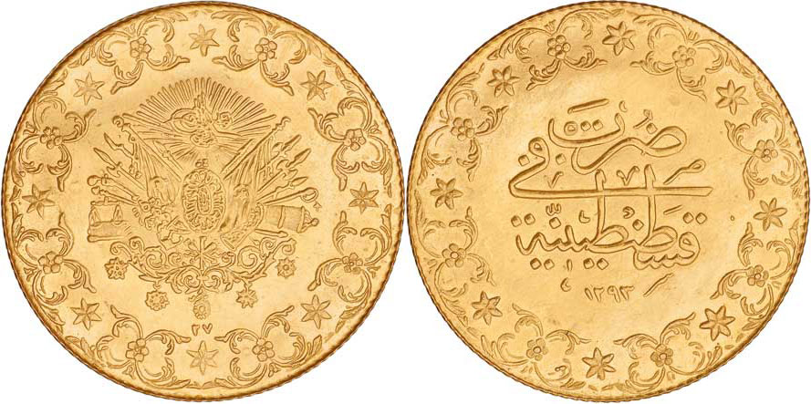 500 Piastr, AH.1293, 27.rok vlády (= 1902), KM.746, luxusní ražba pro reprezentační účely, Au917, 50mm, 35.990g, nep.hr., vlas.rysky, téměř R!