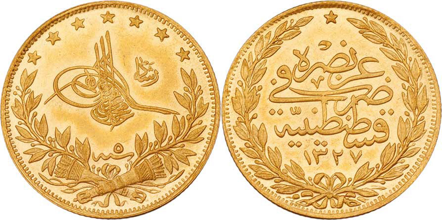 100 Piastr, AH.1327, 5.rok vlády (= 1913), KM.754, Au917, 7.186g, nep.hr., nep.rysky, téměř