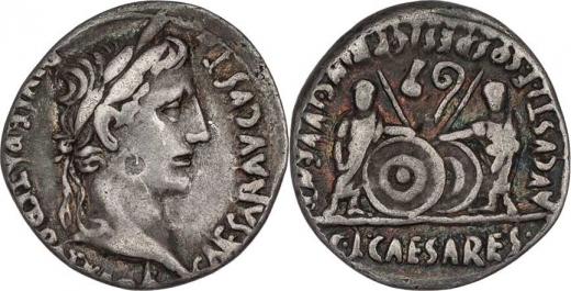 AR Denár, Rv: "C.L.CAESARES.AVGVSTI.F.COS.DESIG. PRINC.IVVENT.", Caius a Lucius se dvěma štíty, S.376, RIC.207 - mincovna Lugdunum, z let 2 př.Kr.-14 po Kr.