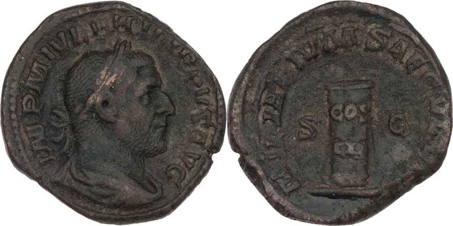 AE Sestercius, Rv:"MILIARIVM.SAECVLVM.COS.III.S.C." sloup s nápisem, S.2496, RIC.157a - mincovna Řím - ražba z roku 248, nepravidelný tvar, exc., pat. RR!