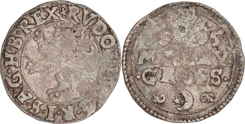 Malý groš 1605, Jáchymov-Gipfel, HN.11a (opis 7c), nápis " 1605 /. MALEY ./. GROSS .", 1.003g, nedor., patina R!