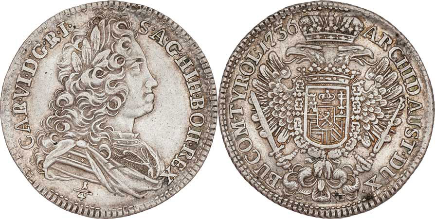 1/4 Tolar 1736, Praha-Scharff, J.16b, MKČ.1818, 7.091g, nep.nedor., pěkná patina, téměř RR!