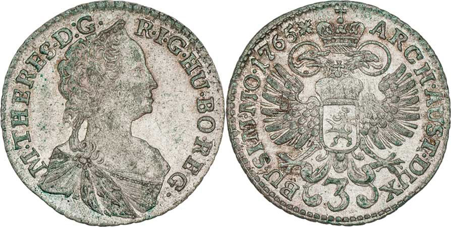 3 Krejcar 1765, Praha-Erdmann, N.37, MKČ.1973, 1.665g, nep.just., nep.rysky, patina R!