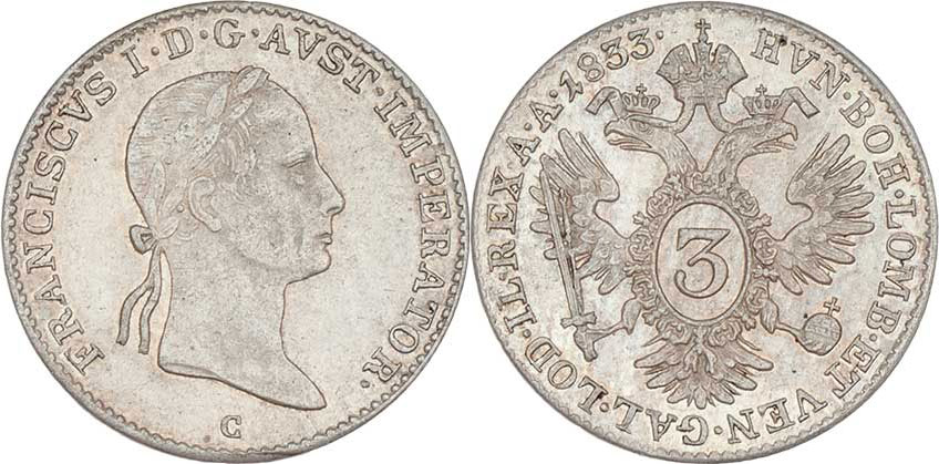Ag 3 Krejcar 1833 C, 1.741g, nep.hr., nep.rysky, pěkná patina R!