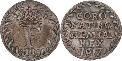 Malý jeton na korunovaci v Praze 29.6.1617 - korunov. monogram ve věnci/ 5-řádkový nápis ve věnci, Nesign., Ag 17mm, 1.069g, Don.2121, ČS.435, Nov.A.3b, patina