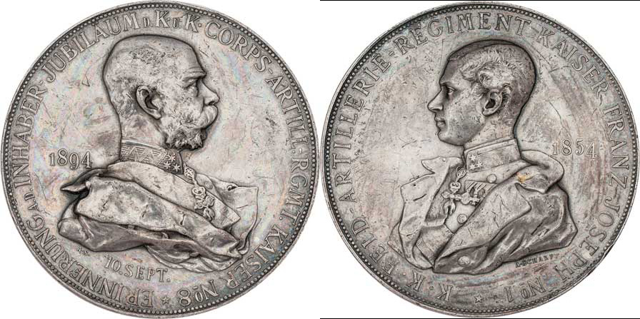 Scharff - 40 let pražského dělostřel. pluku 1894 - mladý portrét, tři vyznamenání, opis / starý portrét, opis, Sign., Ag 39mm, 34.782g, Haus.1143, hr., rysky