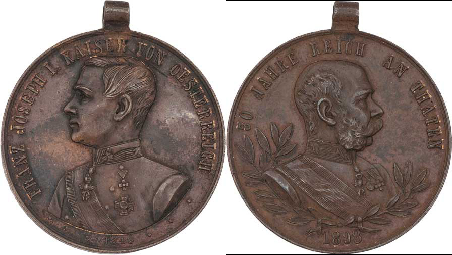 Nesign. - medailka na 50 let vlády 1898 - mladé poprsí zleva, vročení, opis / staré poprsí zprava, vročení, opis, měď 34 mm s původ. ouškem, škr., pat.