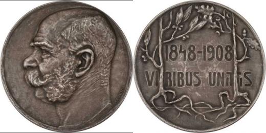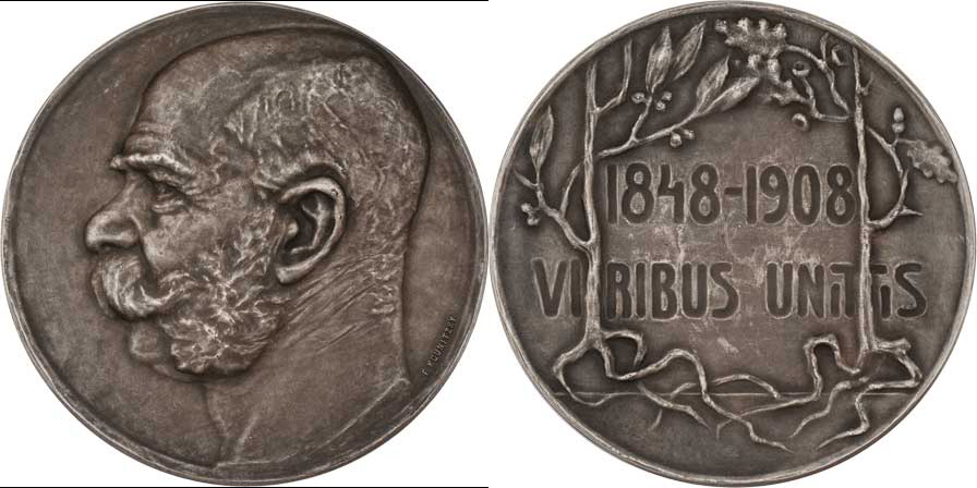 Kounický - medaile na 60 let vlády 1908 - hlava zleva / vročení a nápis mezi vavřínovým a dubovým stromkem, Sign., patinovaný postříbřený bronz 62 mm