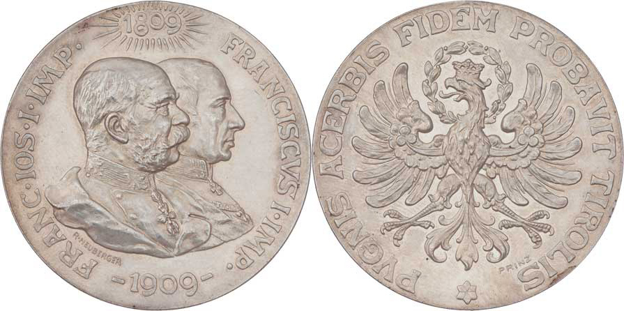 Neuberger a Prinz - 100.výročí obrany Tyrol 1909 - poprsí Františka II. a Fr.Josefa zprava, opis / znak a opis, Sign., Punc., Ag 45mm, 40.060g, nep.rysky