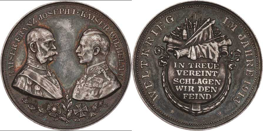 Oertel - medaile na světovou válku 1914 - portréty Fr.Josefa a Viléma II., opis / zbraně, nápis ve věnci a opis, Sign., Punc., Ag990, 35mm, 17.801g, patina