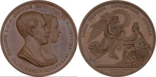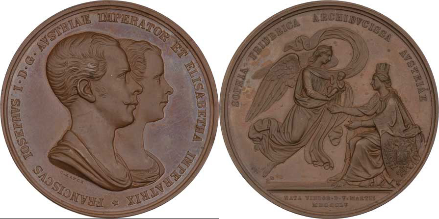 Lange - AE medaile na narození dcery Sofie 5.3.1855 - dvojportrét zprava, opis / anděl předává dítě sedící Austrii, písmo, 56mm, H.3767, dr.hr., patina, etue