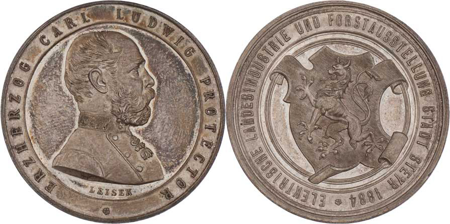 Steyr - elektrotechnická a hospodářská výstava 1884 - poprsí zprava, opis / znak města, opis, Sign.Leisek, Punc., Ag 39 mm, 23.182g, krásná patina, původní etue