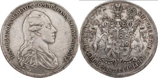 1/2 Tolar 1777 - poprsí zprava, opis / honosný erb s přilbicemi, klenoty a štítonoši, opis, M.3280, H.5704, PR.257, 13.932g, nep.hr., nep.rysky, patina