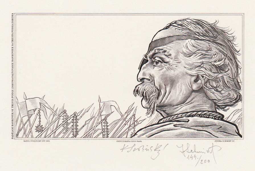 25 Koruna 1958 - černotisk rytiny Jana Žižky - číslovaný (144/200), vlastnoruční podpisy autorů K.Svolinský, J.Schmidt