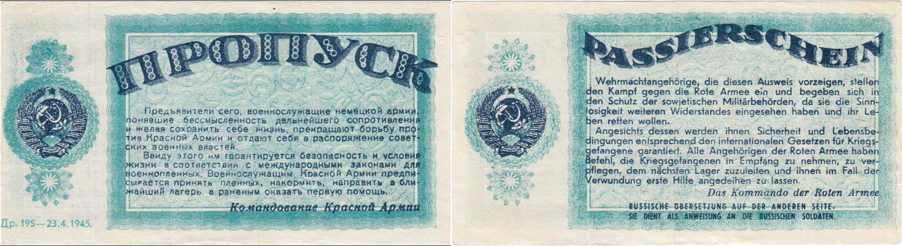 Propustka pro německé dezertéry - propagandistický letát s výzvou k dezerci 23.4.1945 R!