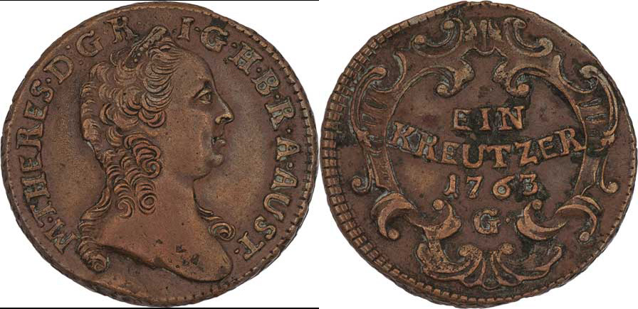Cu Krejcar 1763 G, Štýrský Hradec, N.41, 12.046g, dr.vady materiálu, skvrnky, patina R!