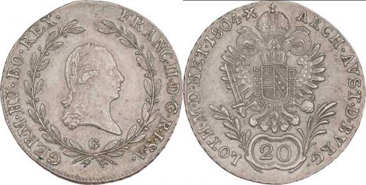 20 Krejcar 1804 G, Nagybanya, 6.680g, pěkná patina, téměř R!