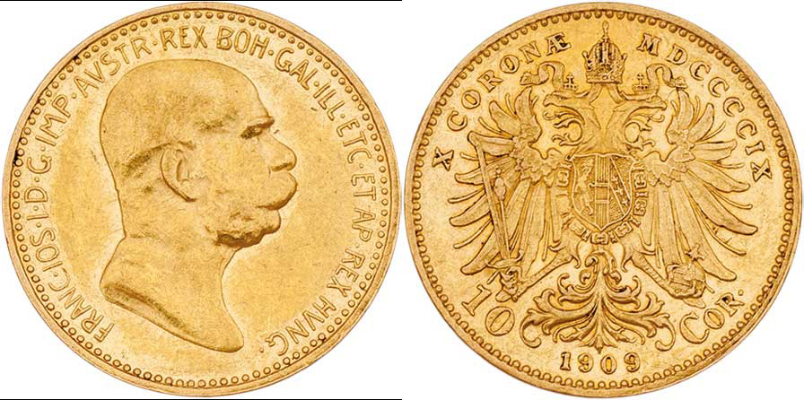 10 Koruna 1909 - Marschall, 3.379g, nep.hr., nep.rysky, téměř