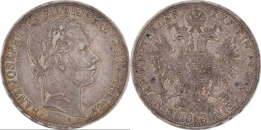 Tolar spolkový 1858 A, 18.488g, dr.hr., dr.rysky, patina