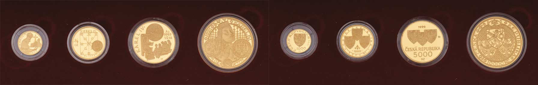 Sada zlatých mincí 1999 - Karel IV. (10000, 5000, 2500, 1000 Koruna = 1, 1/2, 1/4, 1/10 Unce), 31.11g, 15.55g, 7.78g, 3.11g, kapsle, společná etue, karty