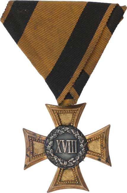 Služební kříž za 18 let - typ 1869, Marko.375, VM.2/8-1867-D, nýtov. postříbřený medailon s bohatým věncem, původní trojúhelníková stuha