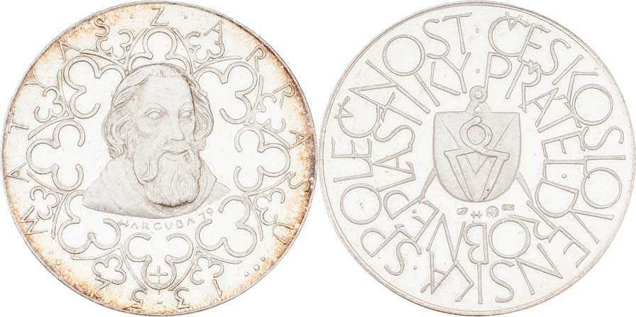 ČSPDP - Matyáš z Arrasu (zemřel 1352) 1979 - poprsí mírně zprava, okenní kružby, opis / znak kmenické huti a opisy, Sign., Ag900, 38mm, 29.994g