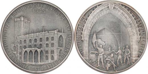 Sto let revoluce a tři roky Pražského povstání 1948 - studenti bránící Mosteckou věž, opis / Staroměstská radnice, opis, Sign., patinov. Ag 900, 40mm, 35.978g