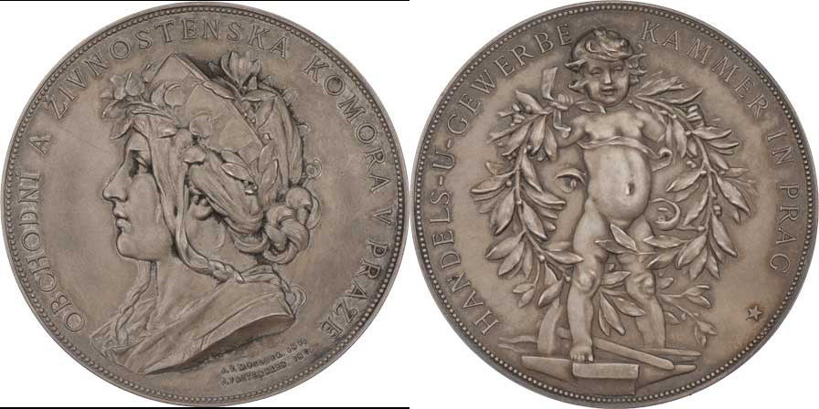 Obchodní a živnost. komora v Praze - AR medaile b.l.- personif. Prahy zleva, opis / putti na kovář. nářadí, věnec, opis, Sign., Punc., 56mm, 66.822g, původ.etue