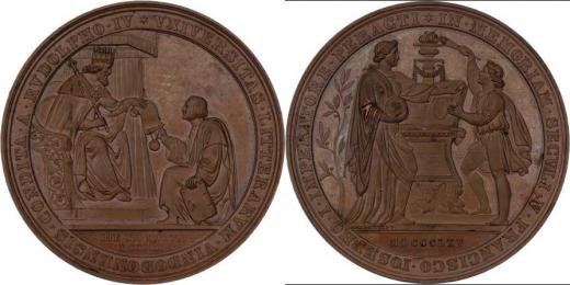 Vídeň - 500 let university 1865 - předání zakládací listiny, opis a nápis / dvě postavy u oltáře, vavřín, opis a vročení, Sign., bronz 78 mm, dr.hr., patina