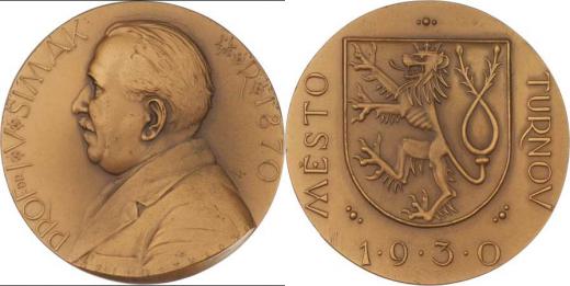 Prof.Dr.J.V.Šimák, historik - město Turnov 1870/1930 - poprsí zleva, opis / štít s českým lvem, nápisy, Sign., patinovaný bronz 50 mm, pouze 100ks RR!