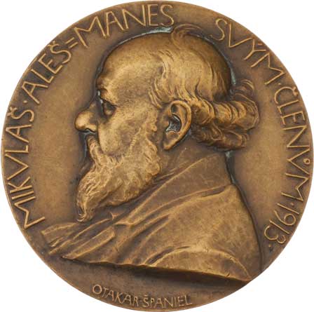 Mikuláš Aleš - Mánes svým členům na rok 1913 - poprsí zleva, opis, Sign., jednostr.patin.bronz 52mm, OŠ.158