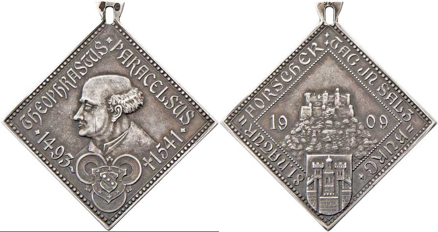 81.sjezd rak. přírodovědců 1909 - poprsí Paracelsa zleva, znak, opis / hrad na skále, znak, písmo, Nesign., Ag950, 28x28mm s pův.ouškem, 8.041g, dr.škr.