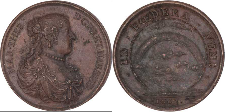 Marie Terezie Španělská - manželka Ludvíka XIV. 1662 - poprsí zprava, opis / duha v oblacích, opis a vročení, Nesign., měď 38mm, 17.747g, pěkná patina