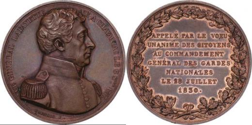 Generál Lafayette - zřízení Národní gardy 28.7.1830 - poprsí zprava, opis / 7-řádkový nápis ve věnci, Sign. Caunois, nep.hr., vlas.škr. v reversu, pěkná patina