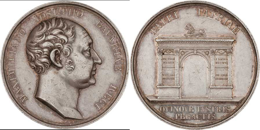 Maxmilian Josef 1824 - medaile na 25 let vlády - poprsí zprava, opis / Vítězný oblouk, opis a nápis, Sign.Losch, Ag 47mm, 43.766g, nep.hr., nep.rys., pat.